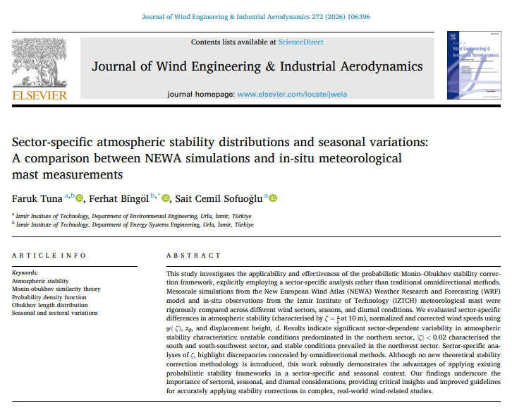 Yeni Avrupa Rüzgâr Atlası (NEWA) kapsamında geliştirilen Weather Research and Forecasting (WRF) mezoskal modeli simülasyonları ile İzmir Yüksek Teknoloji Enstitüsü (İYTE) meteoroloji direğinden elde edilen yerinde gözlem verileri; farklı rüzgâr sektörleri, mevsimsel koşullar ve gün içi zaman dilimleri açısından ayrıntılı ve sistematik biçimde karşılaştırılmıştır. Çalışmada, atmosferik kararlılıktaki sektöre özgü farklılıklar, 10 m yüksekliğinde ζ = z/L parametresi kullanılarak değerlendirilmiş; ayrıca ψ(ζ), yüzey pürüzlülük uzunluğu z₀ ve sıfır düzlem yer değiştirme yüksekliği d yardımıyla normalize edilmiş ve düzeltilmiş rüzgâr hızları analiz edilmiştir.