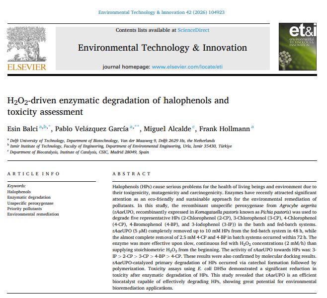 Halofenoller (HP’ler), toksik, mutajenik ve karsinojenik özellikleri nedeniyle canlı sağlığı ve çevre açısından ciddi sorunlara yol açmaktadır. Enzimler, kirleticilerin çevresel giderimi için çevre dostu ve sürdürülebilir bir yaklaşım olarak son yıllarda önemli ölçüde ilgi çekmektedir. Bu çalışmada, Agrocybe aegerita kaynaklı rekombinant nonspesifik peroksijenaz enzimi (rAaeUPO; Pichia pastoris olarak bilinen Komagataella pastoris’te rekombinant olarak eksprese edilmiştir), beş temsilî halofenolün [2 klorofenol (2 CP), 3 klorofenol (3 CP), 4 klorofenol (4 CP), 4 bromofenol (4 BP) ve 3 iyodofenol (3 IP)] parçalanmasında kesikli ve beslemeli kesikli sistemlerde kullanılmıştır. rAaeUPO (5 µM), beslemeli kesikli sistemde 48 saat içinde 10 mM’ye kadar HP’leri tamamen gidermiştir; buna karşılık, kesikli sistemlerde 2.5 mM 4 CP ve 4 BP’nin neredeyse tamamen giderimi 72 saat içinde gerçekleşmiştir. Enzim, başlangıçta stokiyometrik miktarda H2O2 verilmesine kıyasla, H2O2’nin yavaş ve sürekli olarak 2 mM/saat hızında beslendiği koşullarda daha etkili bulunmuştur. rAaeUPO’nun HP’lere karşı aktivite sıralaması 3 IP > 2 CP > 3 CP > 4 BP > 4 CP şeklinde belirlenmiştir. Bu sonuçlar, moleküler kenetlenme bulguları ile de doğrulanmıştır. rAaeUPO katalizli HP bozunmasının birincil mekanizmasının, önce katekol oluşumu ve ardından polimerizasyon basamağı üzerinden gerçekleştiği görülmüştür. E. coli DH5α kullanılarak gerçekleştirilen toksisite testleri, HP’lerin enzimatik bozunması sonrasında toksisitede anlamlı bir azalma olduğunu göstermiştir. Bu çalışma, rAaeUPO’nun HP’leri etkili biçimde parçalayabilen verimli bir biyokatalizör olduğunu ve çevresel biyoremediasyon uygulamaları açısından büyük potansiyel taşıdığını ortaya koymuştur.
